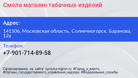 Смола, магазин табачных изделий по адресу 141506, Московская область, Солнечногорск, Баранова, 12а в дальнейшем Организация, размещена в следующих категориях: