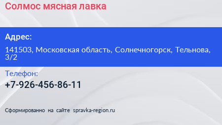 Солмос, мясная лавка по адресу 141503, Московская область, Солнечногорск, Тельнова, 3/2 в дальнейшем Организация, размещена в следующих категориях: