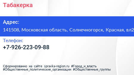 Табакерка по адресу 141508, Московская область, Солнечногорск, Красная, вл2 в дальнейшем Организация, размещена в следующих категориях: