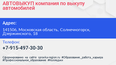 АВТОВЫКУП, компания по выкупу автомобилей по адресу 141506, Московская область, Солнечногорск, Дзержинского, 18 в дальнейшем Организация, размещена в следующих категориях: