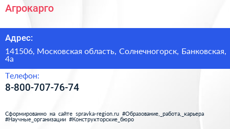 Агрокарго по адресу 141506, Московская область, Солнечногорск, Банковская, 4а в дальнейшем Организация, размещена в следующих категориях: