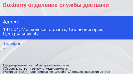 Boxberry, отделение службы доставки по адресу 141504, Московская область, Солнечногорск, Центральная, 4а в дальнейшем Организация, размещена в следующих категориях: