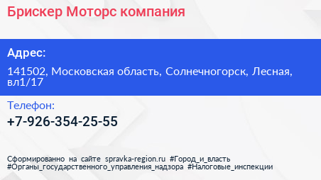 Брискер-Моторс, компания по адресу 141502, Московская область, Солнечногорск, Лесная, вл1/17 в дальнейшем Организация, размещена в следующих категориях:
