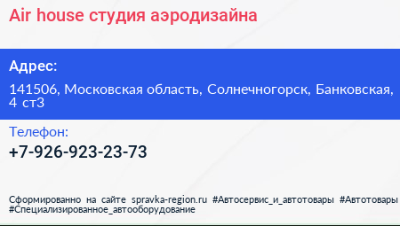 Air house, студия аэродизайна по адресу 141506, Московская область, Солнечногорск, Банковская, 4 ст3 в дальнейшем Организация, размещена в следующих категориях: