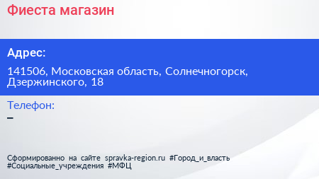 Фиеста, магазин по адресу 141506, Московская область, Солнечногорск, Дзержинского, 18 в дальнейшем Организация, размещена в следующих категориях: