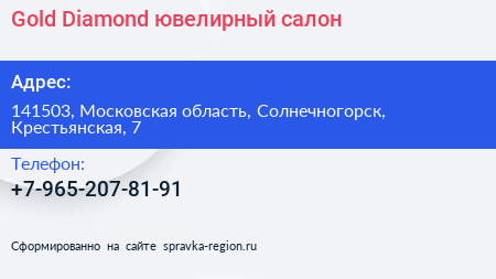 Gold & Diamond, ювелирный салон по адресу 141503, Московская область, Солнечногорск, Крестьянская, 7 в дальнейшем Организация, размещена в следующих категориях: