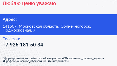 Люблю, ценю, уважаю! по адресу 141507, Московская область, Солнечногорск, Подмосковная, 7 в дальнейшем Организация, размещена в следующих категориях: