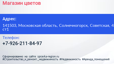 Магазин цветов по адресу 141503, Московская область, Солнечногорск, Советская, 4 ст1 в дальнейшем Организация, размещена в следующих категориях:
