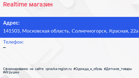 Realtime, магазин по адресу 141503, Московская область, Солнечногорск, Красная, 22а в дальнейшем Организация, размещена в следующих категориях: