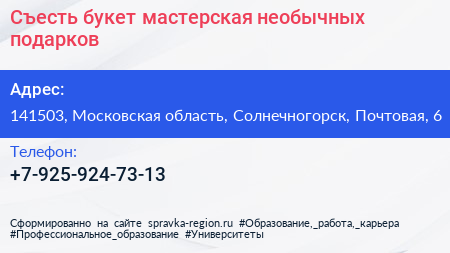 Съесть букет, мастерская необычных подарков по адресу 141503, Московская область, Солнечногорск, Почтовая, 6 в дальнейшем Организация, размещена в следующих категориях: