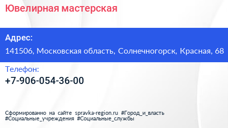 Ювелирная мастерская по адресу 141506, Московская область, Солнечногорск, Красная, 68 в дальнейшем Организация, размещена в следующих категориях: