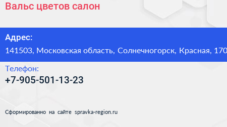 Вальс цветов, салон по адресу 141503, Московская область, Солнечногорск, Красная, 170 в дальнейшем Организация, размещена в следующих категориях: