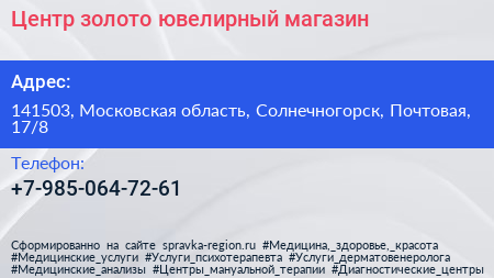 Центр золото, ювелирный магазин по адресу 141503, Московская область, Солнечногорск, Почтовая, 17/8 в дальнейшем Организация, размещена в следующих категориях: