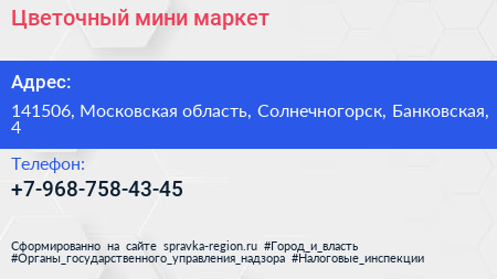 Цветочный мини-маркет по адресу 141506, Московская область, Солнечногорск, Банковская, 4 в дальнейшем Организация, размещена в следующих категориях: