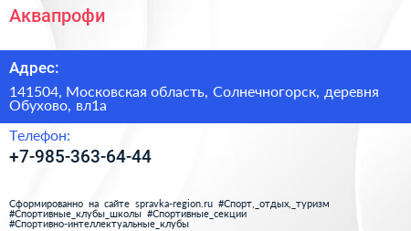 Аквапрофи по адресу 141504, Московская область, Солнечногорск, деревня Обухово, вл1а в дальнейшем Организация, размещена в следующих категориях: