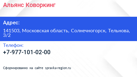 Альянс Коворкинг по адресу 141503, Московская область, Солнечногорск, Тельнова, 3/2 в дальнейшем Организация, размещена в следующих категориях: