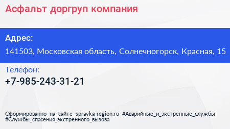 Асфальт-доргруп, компания по адресу 141503, Московская область, Солнечногорск, Красная, 15 в дальнейшем Организация, размещена в следующих категориях: