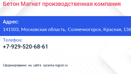 Бетон Магнат, производственная компания по адресу 141503, Московская область, Солнечногорск, Красная, 136 в дальнейшем Организация, размещена в следующих категориях: