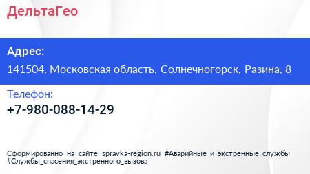 ДельтаГео по адресу 141504, Московская область, Солнечногорск, Разина, 8 в дальнейшем Организация, размещена в следующих категориях: