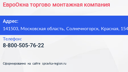 ЕвроОкна, торгово-монтажная компания по адресу 141503, Московская область, Солнечногорск, Красная, 154 в дальнейшем Организация, размещена в следующих категориях: