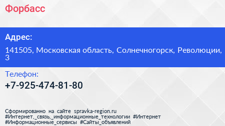 Форбасс по адресу 141505, Московская область, Солнечногорск, Революции, 3 в дальнейшем Организация, размещена в следующих категориях: