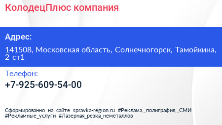 КолодецПлюс, компания по адресу 141508, Московская область, Солнечногорск, Тамойкина, 2 ст1 в дальнейшем Организация, размещена в следующих категориях: