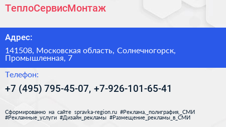 ТеплоСервисМонтаж по адресу 141508, Московская область, Солнечногорск, Промышленная, 7 в дальнейшем Организация, размещена в следующих категориях: