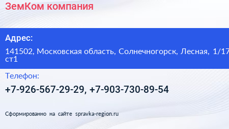 ЗемКом, компания по адресу 141502, Московская область, Солнечногорск, Лесная, 1/17 ст1 в дальнейшем Организация, размещена в следующих категориях: