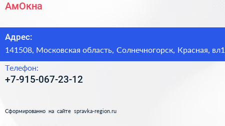 АмОкна по адресу 141508, Московская область, Солнечногорск, Красная, вл1 в дальнейшем Организация, размещена в следующих категориях: