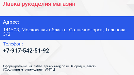Лавка рукоделия, магазин по адресу 141503, Московская область, Солнечногорск, Тельнова, 3/2 в дальнейшем Организация, размещена в следующих категориях: