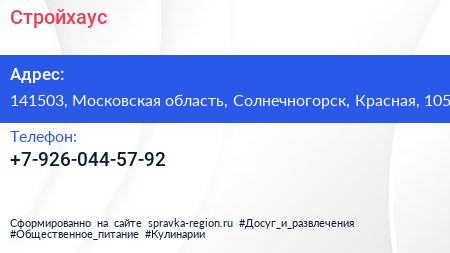 Стройхаус по адресу 141503, Московская область, Солнечногорск, Красная, 105 в дальнейшем Организация, размещена в следующих категориях: