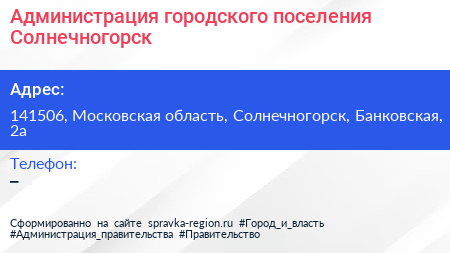 Администрация городского поселения Солнечногорск по адресу 141506, Московская область, Солнечногорск, Банковская, 2а в дальнейшем Организация, размещена в следующих категориях: