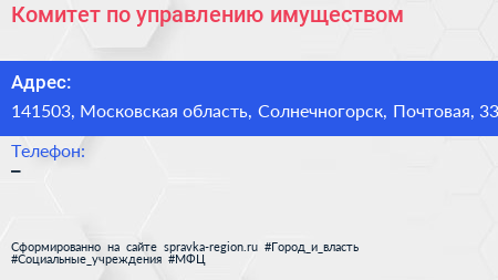 Комитет по управлению имуществом по адресу 141503, Московская область, Солнечногорск, Почтовая, 33 в дальнейшем Организация, размещена в следующих категориях: