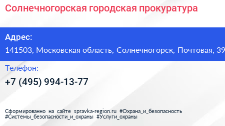 Солнечногорская городская прокуратура по адресу 141503, Московская область, Солнечногорск, Почтовая, 39 в дальнейшем Организация, размещена в следующих категориях: