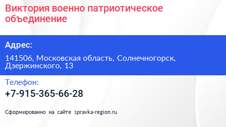 Виктория, военно-патриотическое объединение по адресу 141506, Московская область, Солнечногорск, Дзержинского, 13 в дальнейшем Организация, размещена в следующих категориях:
