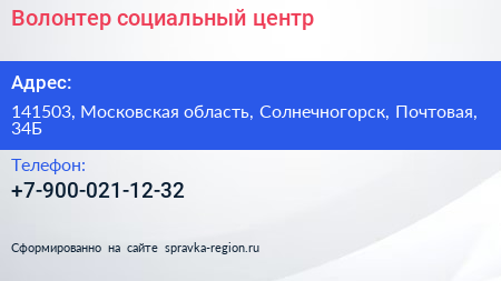 Волонтер, социальный центр по адресу 141503, Московская область, Солнечногорск, Почтовая, 34Б в дальнейшем Организация, размещена в следующих категориях: