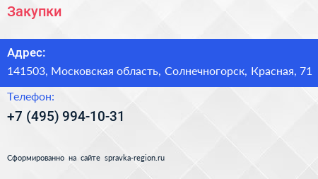 Закупки по адресу 141503, Московская область, Солнечногорск, Красная, 71 в дальнейшем Организация, размещена в следующих категориях: