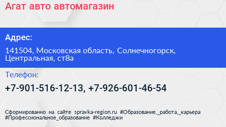 Агат авто, автомагазин по адресу 141504, Московская область, Солнечногорск, Центральная, ст8а в дальнейшем Организация, размещена в следующих категориях: