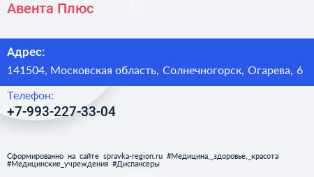 Авента Плюс по адресу 141504, Московская область, Солнечногорск, Огарева, 6 в дальнейшем Организация, размещена в следующих категориях:
