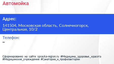 Автомойка по адресу 141504, Московская область, Солнечногорск, Центральная, 10/2 в дальнейшем Организация, размещена в следующих категориях: