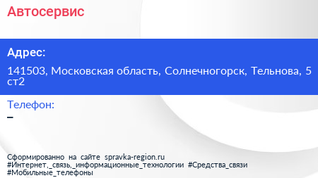 Автосервис по адресу 141503, Московская область, Солнечногорск, Тельнова, 5 ст2 в дальнейшем Организация, размещена в следующих категориях: