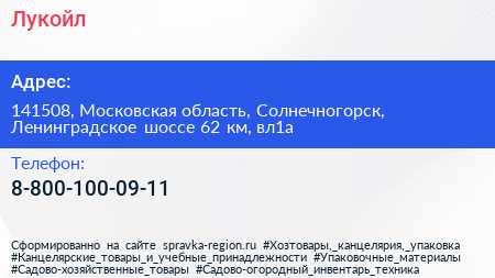 Лукойл по адресу 141508, Московская область, Солнечногорск, Ленинградское шоссе 62 км, вл1а в дальнейшем Организация, размещена в следующих категориях: