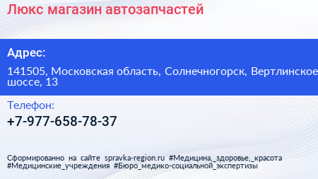 Люкс, магазин автозапчастей по адресу 141505, Московская область, Солнечногорск, Вертлинское шоссе, 13 в дальнейшем Организация, размещена в следующих категориях: