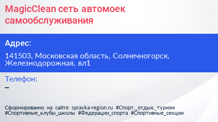 MagicClean, сеть автомоек самообслуживания по адресу 141503, Московская область, Солнечногорск, Железнодорожная, вл1 в дальнейшем Организация, размещена в следующих категориях:
