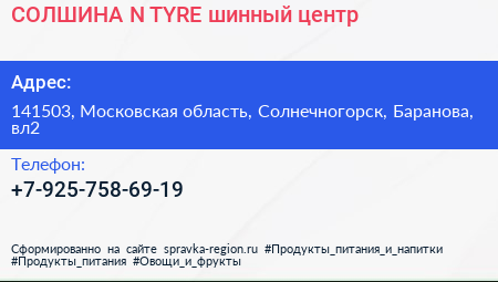 СОЛШИНА N-TYRE, шинный центр по адресу 141503, Московская область, Солнечногорск, Баранова, вл2 в дальнейшем Организация, размещена в следующих категориях: