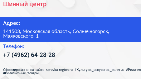 Шинный центр по адресу 141503, Московская область, Солнечногорск, Маяковского, 1 в дальнейшем Организация, размещена в следующих категориях: