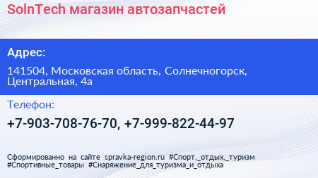 SolnTech, магазин автозапчастей по адресу 141504, Московская область, Солнечногорск, Центральная, 4а в дальнейшем Организация, размещена в следующих категориях: