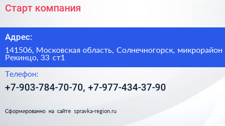 Старт, компания по адресу 141506, Московская область, Солнечногорск, микрорайон Рекинцо, 33 ст1 в дальнейшем Организация, размещена в следующих категориях: