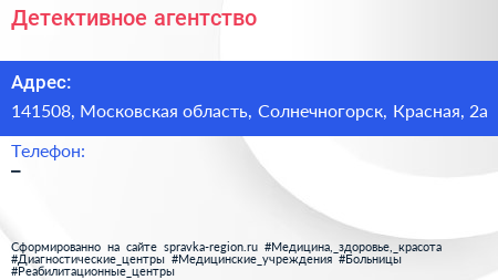 Детективное агентство по адресу 141508, Московская область, Солнечногорск, Красная, 2а в дальнейшем Организация, размещена в следующих категориях: