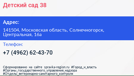 Детский сад №38 по адресу 141504, Московская область, Солнечногорск, Центральная, 16а в дальнейшем Организация, размещена в следующих категориях: